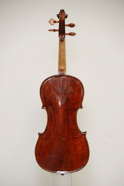 入荷した楽器は、オープンして内部の剥がれ、割れ等を徹底的に直し た後、必要に応じてバスバー等の交換、ネックの幅、厚み角度等を確認してからの指板の交換、糸巻穴の穴埋め、ニスのレタッチ等を行い、駒、魂柱、弦巻き等を交換 しています。その結果、すべて新作とほとんど変わらない使用感と安定性が望めます。特に19世紀Mittenwaldの Neuner&HornsteinerやBadderなどは、完全手工品で材料が良質、音の良い物が多いですが、内部の造りが雑なので、必ずオー プンして細部を修正する必要があります。一般に出回っている物では、コストの面からここまで徹底してレストアしてある場合は少ないと思われます。